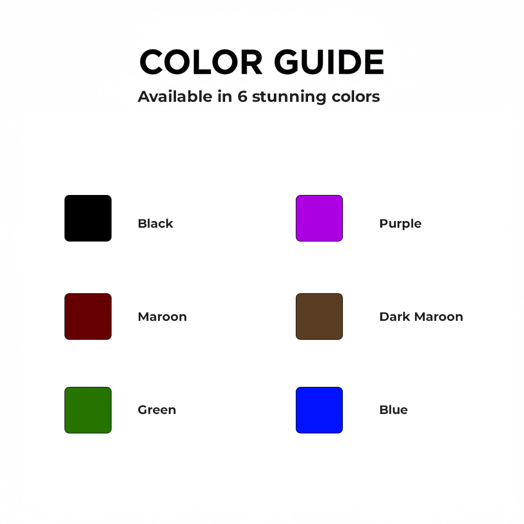 Black, Blue, Dark Brown, Green, Maroon, Purple
