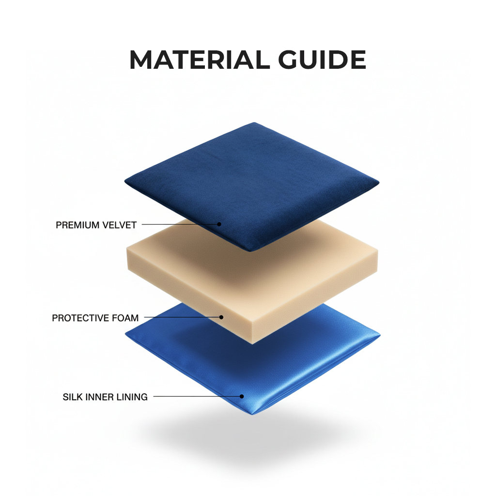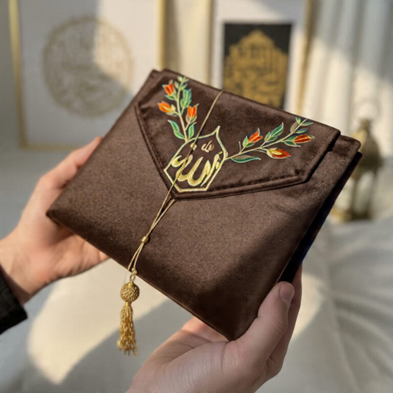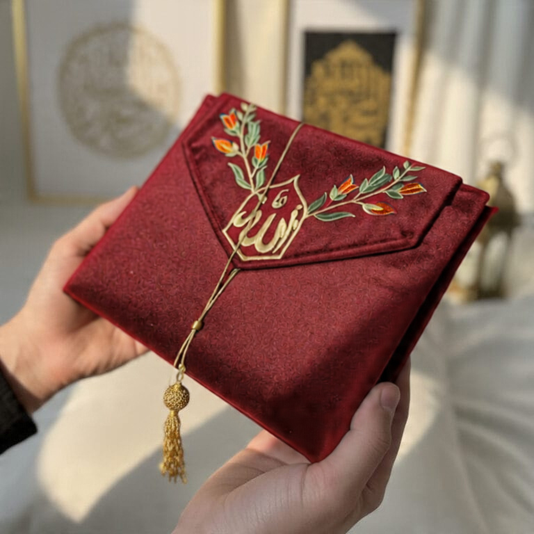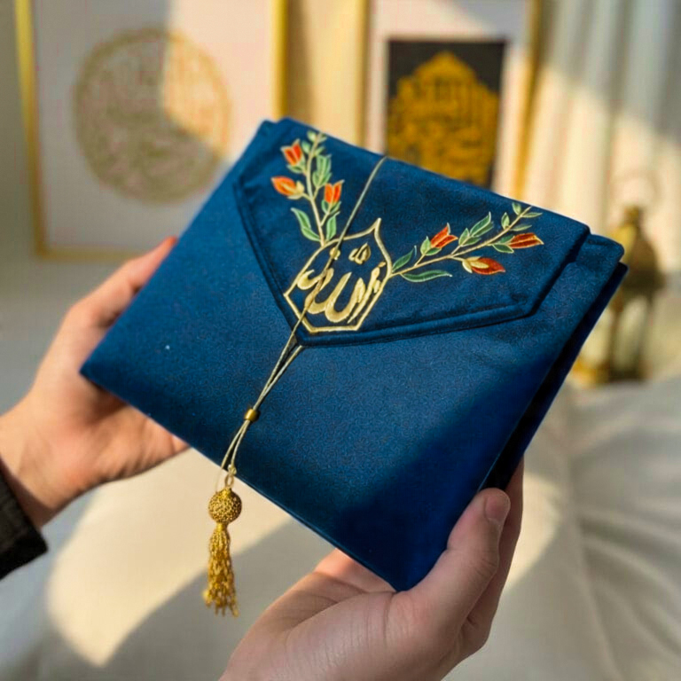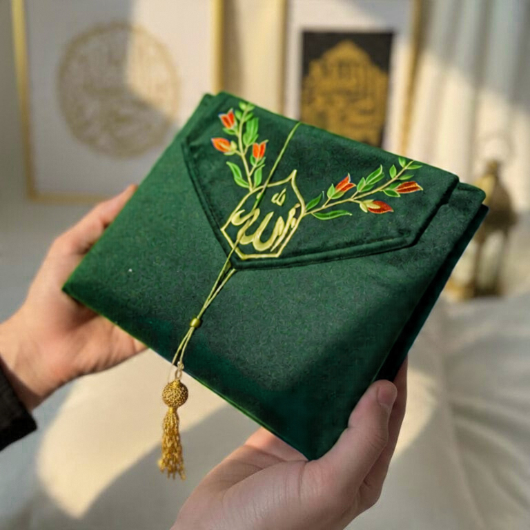 This luxurious Velvet Embroidered Quran Cover features a rich premium velvet exterior adorned with exquisite golden Tilla embroidery of Qur’ani Ayat framed in an elegant laurel wreath design. The interior is lined with smooth silk fabric, and a soft foaming layer is sandwiched between the velvet and silk for added cushioning and protection. ✨📿